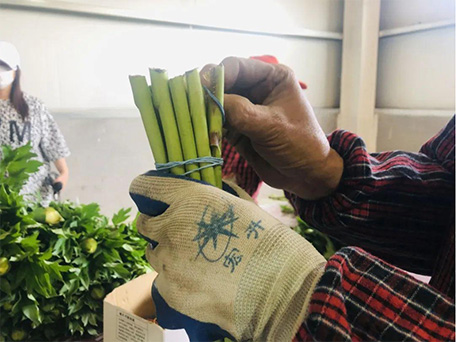 Fresh cut flowers are sorted and tied together,completing the processes of root cutting, leaf combing, stabbing and tying in one go,